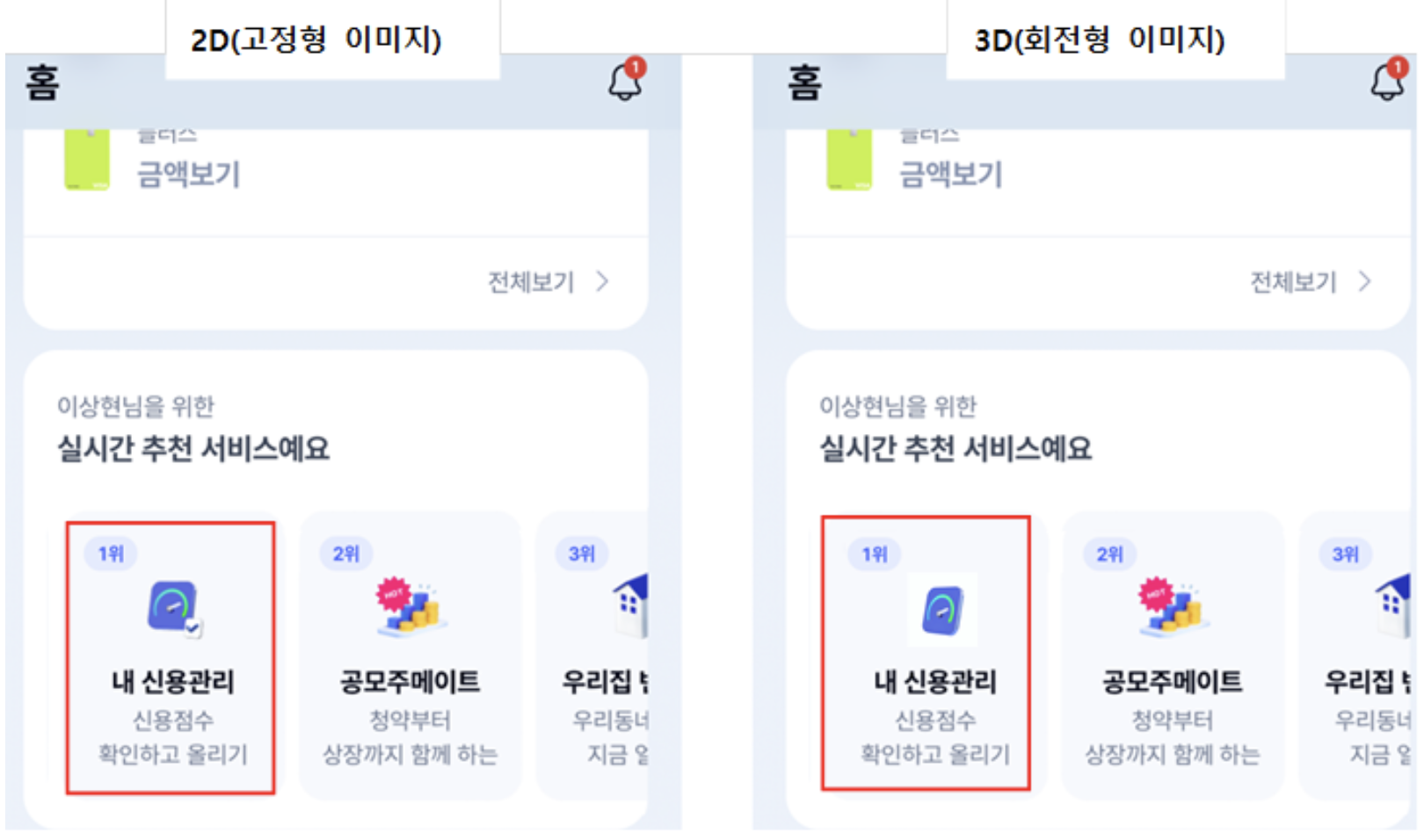 조용걸님이 제작한 Turn Table 효과 애니메이션 아이콘을 홈 화면의 실시간 인기 영역 - 내 신용관리 AB 테스트에 적용한 결과입니다.