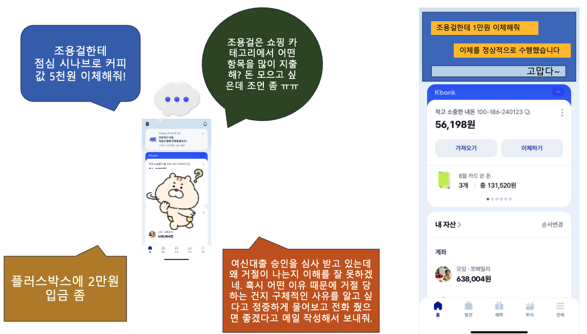 미래의 은행앱이 어떤 형태일지에 대해서는 함부로 예단하기 어렵지만 행 내부적으로는 아래 이미지처럼 AI 비서(자비스) or 챗봇 형태의 인터페이스를 생각하고 있는 것 같습니다.